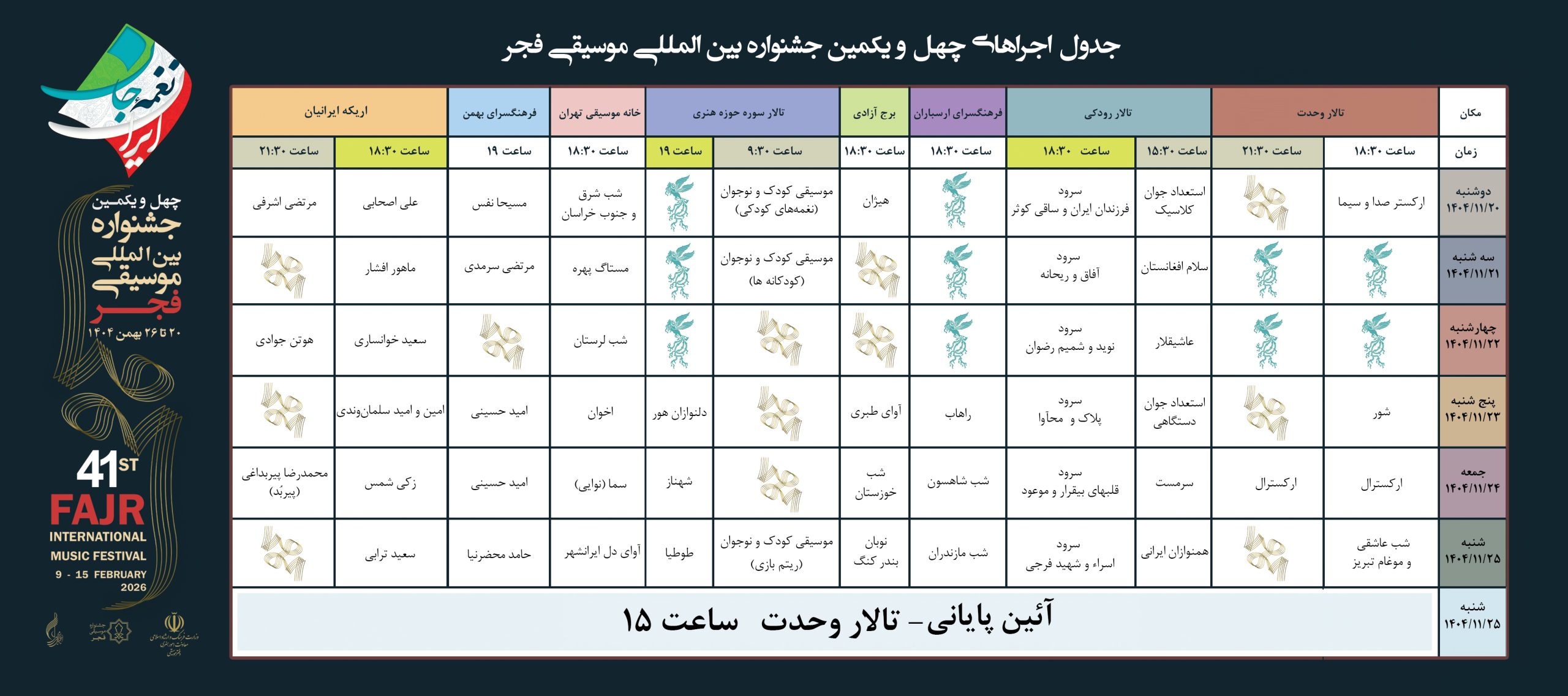 به گزارش روابط عمومی چهل و یکمین جشنواره بین المللی موسیقی فجر، بر اساس این جدول، گروههای شرکت کننده در ۹ سالن رودکی، وحدت، فرهنگسرای ارسباران،برج آزادی، سوره حوزه هنری،خانه موسیقی تهران،فرهنگسرای بهمن،موزه هنرهای معاصر و اریکه ایرانیان به روی صحنه می روند.